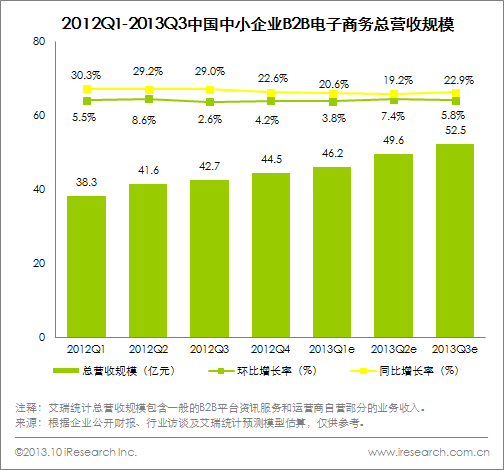 2013Q3中國中小企業(yè)B2B電子商務(wù)市場營收52.5億元,增速平穩(wěn)