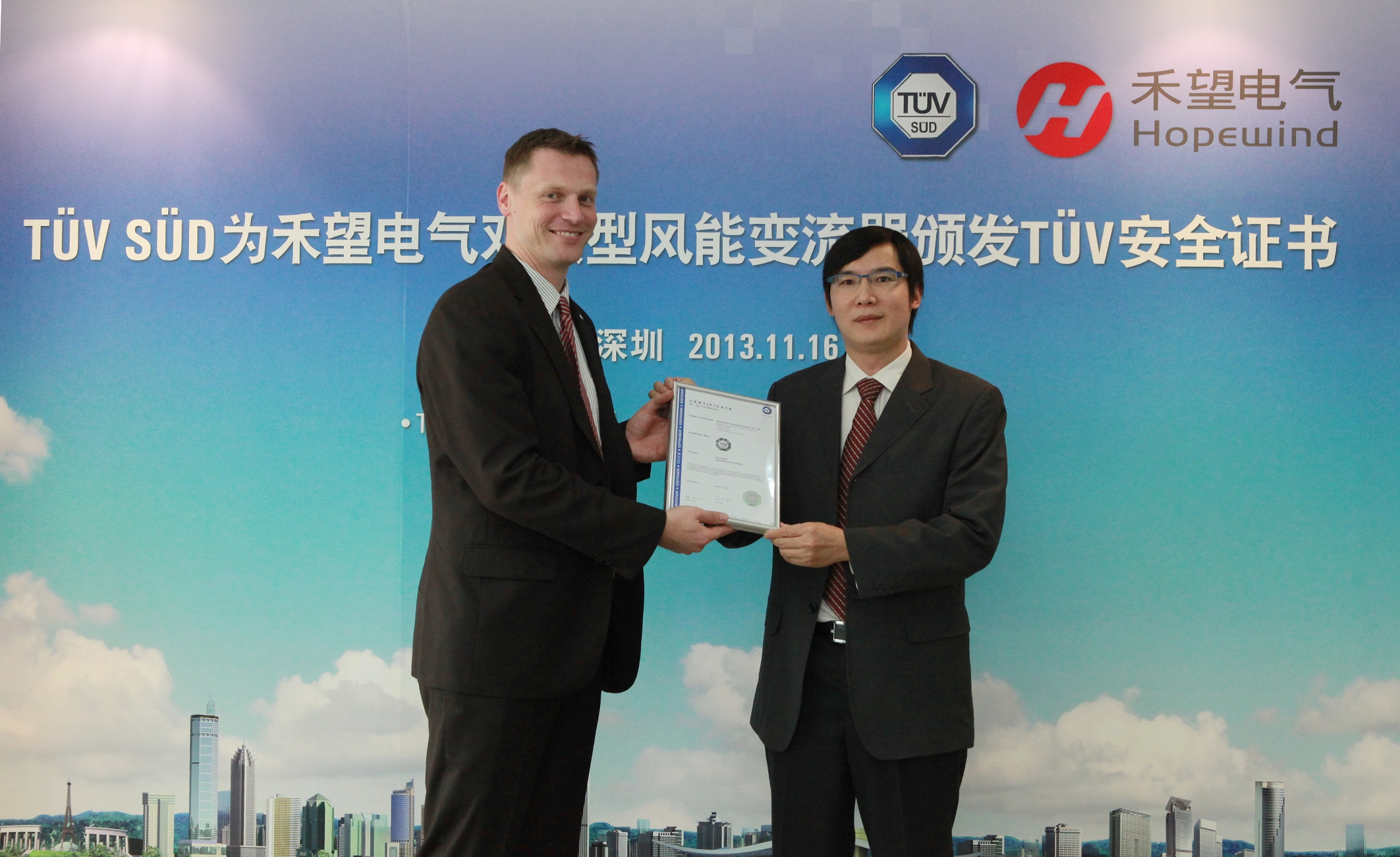 深圳2013年11月18日電 /美通社/ -- 2013年11月14日,TUV南德意志集團(tuán)(以下簡(jiǎn)稱TUV SUD)為深圳市禾望電氣有限公司(以下簡(jiǎn)稱禾望電氣)旗下雙饋型風(fēng)電變流器頒發(fā)了TUV SUD安全認(rèn)證證書,TUV SUD大中華區(qū)高級(jí)副總裁Wolfgang Hubl先生、禾望電氣研發(fā)中心總監(jiān)周黨生先生出席了頒證儀式。