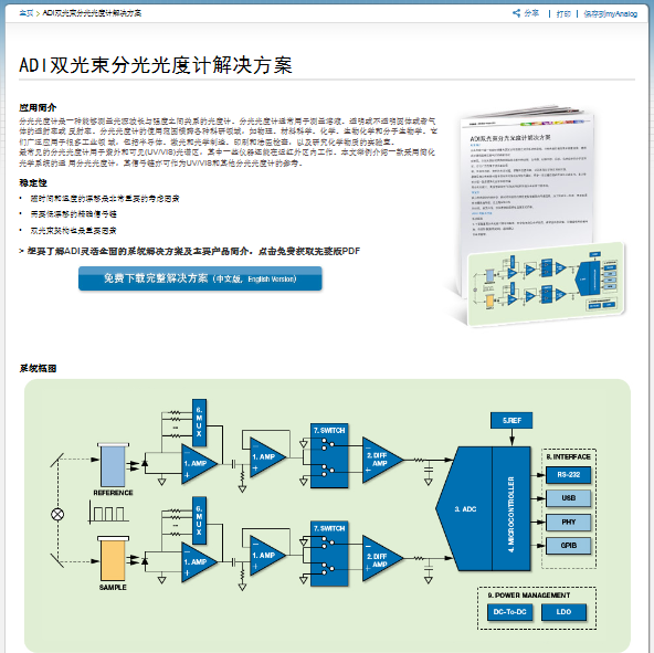 上海2013年11月20日電 /美通社/ -- Analog Devices, Inc.(NASDAQ: ADI),全球領先的高性能信號處理解決方案供應商,近日推出了一款雙光束分光光度計解決方案。作為ADI當月精選方案,這款光度計憑借低功耗、高精度和極度可靠的穩(wěn)定性,可廣泛適用于科研和工業(yè)領域,為工程師解決該類設計難題提供了簡單高效的解決方案。