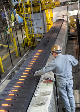 為克服這些阻礙,輝門全新的高度自動化立式鑄造工藝采用了特殊鑄模設(shè)計,為優(yōu)化毛坯和澆注系統(tǒng)的設(shè)計提供了新的機遇,改善對材料流動的控制。借助新型鑄造方法可以圍繞整個鑄造圓周進行供料,顯著地改善了灰口鑄鐵石墨成形的均勻性。通過廣泛監(jiān)控和全程記錄所有相關(guān)參數(shù),全自動化的成型和鑄造工藝確保熔料在鑄模中的流速更為穩(wěn)定,填充更為徹底,從而確?;钊h(huán)質(zhì)量的一致性。
