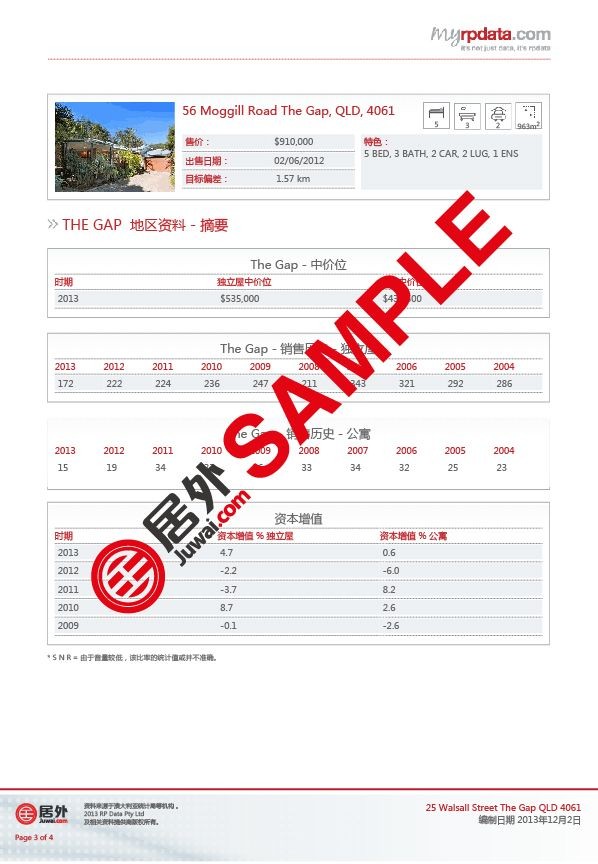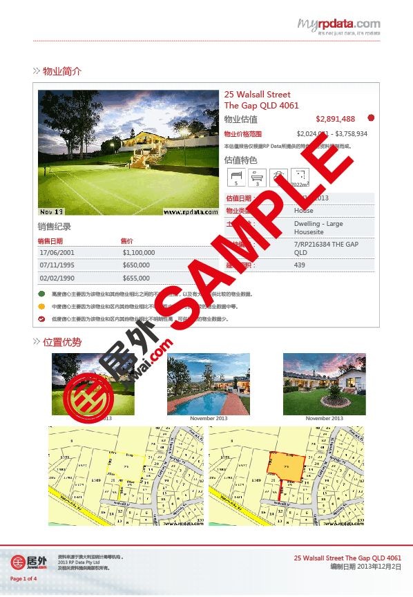 該報告為有意在澳大利亞置業(yè)的中國買家提供極具價值的房產(chǎn)信息,助其做出更明智更博識的投資決定。買家只要登陸居外網(wǎng)澳大利亞房源頁,選取任何一個房源,即可免費獲得該房源的詳細(xì)中文報告。報告涵蓋該房產(chǎn)的銷售歷史、小區(qū)銷售情況、區(qū)內(nèi)人口面貌、家庭收入和結(jié)構(gòu)分析、土地和房價價值評估。報告中所引述的數(shù)據(jù)均來自澳大利亞統(tǒng)計局等政府權(quán)威機構(gòu)。